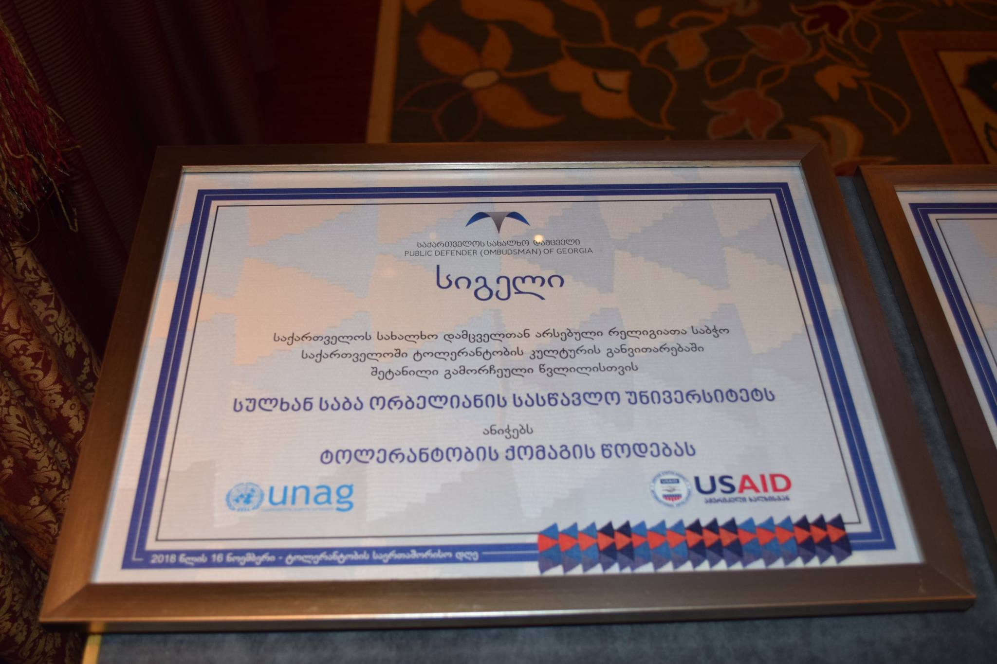 2018 წლის 16 ნოემბერს ტოლერანტობის საერთაშორისო დღესთან დაკავშირებით გამართულ ღონისძიებაზე სულხან-საბა ორბელიანის უნივერსიტეტს ტოლერანტობის ქომაგის ჯილდო გადაეცა. ეს არის ჯილდო, რომლითაც სახალხო დამცველთან არსებული ეროვნულ უმცირესობათა და რელიგიათა საბჭოები ყოველწლიურად, ტოლერანტობის საერთაშორისო დღეს,
